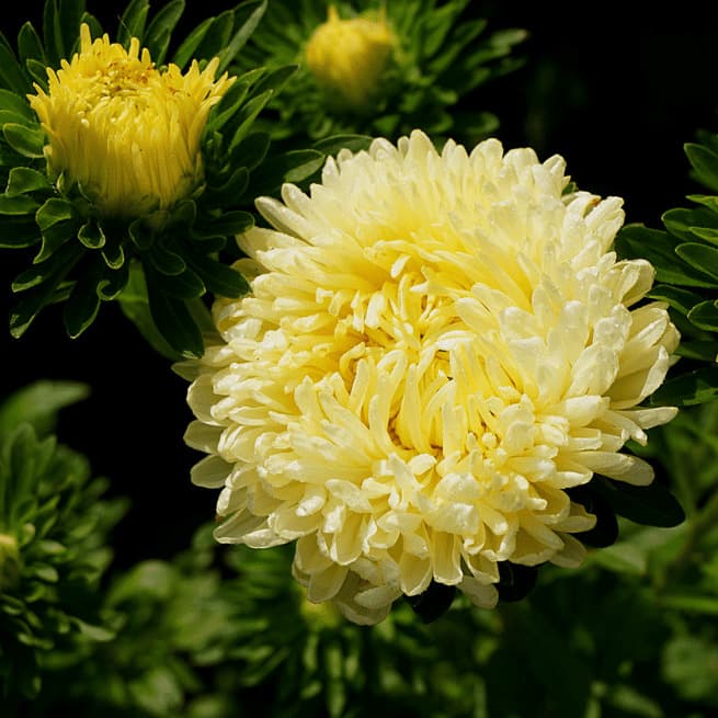 Астра пионовидная "Машенька" - это великолепное растение с жёлтыми цветками, которое порадует вас своей красотой и изяществом. Ее стебель достигает высоты до 70 см, что делает ее идеальным выбором для групповых посадок в вашем саду или огороде. Листья этой астры имеют уникальную форму и размер, что придает растению особый шарм и привлекательность.