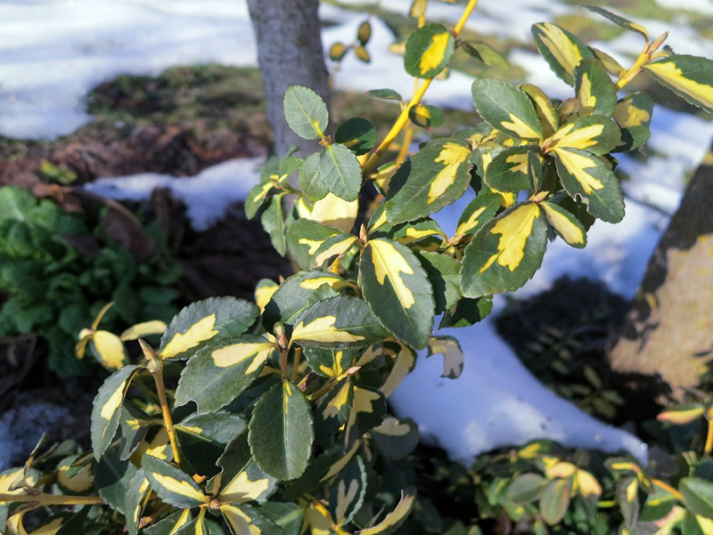 • Весенняя окраска листвы : темно-зеленые с желто-белым пятном в середине