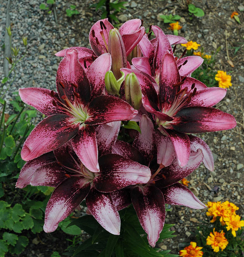Окраска цветка : ярко-розовая с густым темно-бордовым крапом